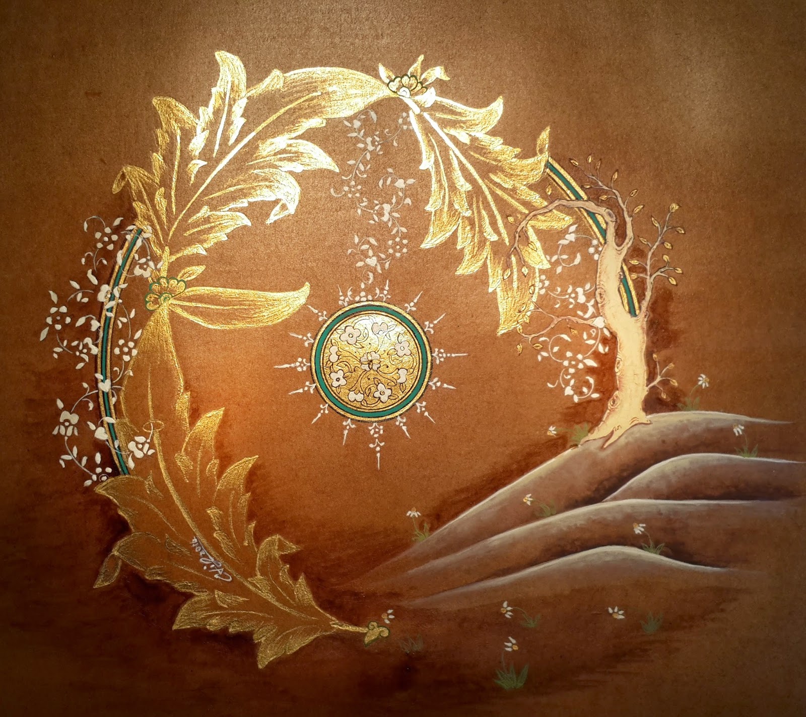 Kullanılan Teknik: Minyatürde kullanılan ponpon agacı formu içine klasik tezhip ve halkari teknikleri uygulanmıştır.